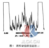 根据疏松缺陷产生的特征,在探测部位上能够辨别出疏松缺陷。疏松缺陷波形参差不齐,有一定宽度,反射波强度比其它缺陷波强度弱。图4是较严重的疏松缺陷探伤波形。