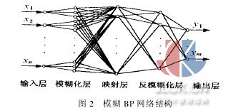 模糊神经网络[7]在本质上是将常规神经网络(BP和Hopfield神经网络等)赋予模糊输入信号或模糊权值。模糊神经网络通常有三类,如具有实数输入信号,且具有模糊权值;具有模糊输入信号,且具有实数权值;具有模糊输入信号,且具有模糊权值。模糊BP神经网络拓扑结构见图2,由输入层、模糊化层、BP网映射层、反模糊化层及输出层组成同层节点中没有任何耦合。模糊神经网络亦是全局逼近器,可用来解决缺陷的定量判别问题。
