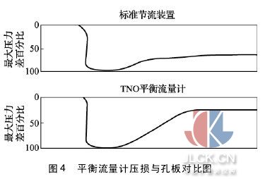 平衡流量计的多孔对称平衡设计,减少涡流形成和降低流阻,大大降低动能损失。如图 4 所示,在同样工况下,选用同样差压值,与标准孔板比较,平衡流量计可降低 1/2 ~ 1/3 压力损失,从而节省运行能量成本。因此,平衡流量计是典型的节能型仪表。