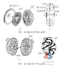 在动力机带动耦合器转动时,首先由泵轮将耦合器腔内液体搅动,在离心力的作用下,腔内液体从半径较小的流道进口处被加速,并抛向半径较大的流道口处,从而液体的动量加大,在泵轮出口处液流以较高的速度和压强冲向涡轮叶片,释放液体动能来推动涡轮旋转做功,实现涡轮将液体动能转化为机械能的过程。当液体的动能减小后,在其后的液体推动下由涡轮流出而进入泵轮,再开始新的能量转化。如此周而复始,输入与输出在没有直接机械连接的情况下由液体动能完成柔性的成功连接(见图1、图 2)。