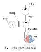 主油箱辅助增压结构油路图如图 2 所示。工作原理为:由电动机通过联轴器带动齿轮泵转动,从油箱中吸入经过吸油过滤器的液压油,经过齿轮泵的作用,输出一定油压的油液到柱塞泵,提升柱塞泵入口油压,从而减少柱塞泵气穴现象,相应减少液压系统的压力波动,使液压元件工作平衡。