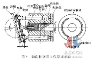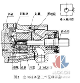 油箱增压结构中的齿轮泵排出压力需要根据主油路柱塞泵的工作压力选定。一般柱塞泵吸油口的压力不应低于 0. 085MPa,而为了避免液压泵的空穴现象,一般情况下吸油口压力 P1与出口压力 P2满足 P2∶ P1< 35,主液压系统柱塞泵出口压力为 40MPa,因此齿轮泵排出压力要求范围为 0. 085 ~1. 143MPa。辅助增压结构 中 选 用 KCB-200 型 齿 轮 泵,其 排 出 压 力 为0. 36MPa,流量为 12m3/ h,所需驱动电动机要求转数为1 440r / min,在一定程度上提高了柱塞泵的吸油口压力,改善了工作状态。图 3 为定向柱塞泵工作原理;图4 为变量轴向柱寒泵工作原理图。