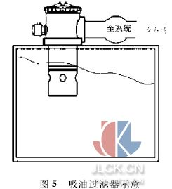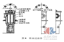 吸油过滤器安装在油泵吸油口处,采用网状粗滤器,吸油筒体浸入油箱内液面以下,过滤器滤头露在油箱外,用以保护油泵及其它液压元件,避免吸入污染杂质,有效地控制液压系统污染,提高液压系统的清洁度,同时又可避免因过滤器压差过高形成油泵吸空。并设有自封阀、旁通阀、滤芯污染堵塞发讯器等装置,使更换滤芯和清洗滤芯时油箱内油液不会流出。吸油过滤器如图 5 所示。