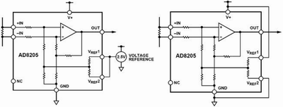 双极性输出时AD8205可以测量流过采样电阻上的双向电流,这时,输出可以偏置到输出范围内的任意位置。当被检测的正反两个方向上的电流为等幅时,其输出必须偏置到满量程输出的中间位置。当双向电流幅值不对称时,输出偏置可以对应地偏离半量程位置。它的两个参考输入VREF1和VREF2分别连接一个内部电阻RREF后接到同一个内部偏置节点,这两个参考输入端的操作方式完全相同。在两个参考电压输入端接入对应的电压,即可完成对输出的偏置。在双极性输出方式下,一般有以下两种连接方式。