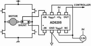 如图5所示连接,AD8205在H桥马达控制电路中作为控制回路的一部分,马达和采样电阻串连后放置在H桥的中间,通过检测采样电阻上的电压,可以准确地测量马达当前的电流及其方向。此时,AD8205的输出被设定成外部参考双向的方式,这样它可以测量H桥开关的双向电流并同时监测马达的运转方向。由于地不是一个特别稳定的参考电平,以地为参考将会导致测量的不准确性。因此,这种测试方案要比以地作为参考电平的测试方法好的多。