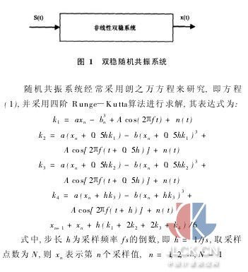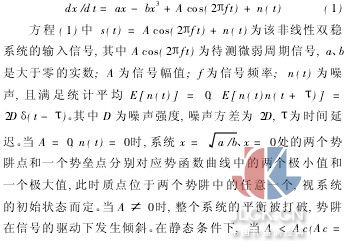 随机共振系统一般包含3个不可缺少的因素:具有双稳态或多稳态的非线性系统、输入信号和噪声。通常用于研究的随机共振系统都是由非线性朗之万(Langevin)方程描述的非线性双稳态系统所定义的: