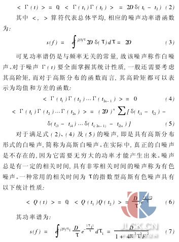 随机共振离不开噪声的帮助,然而噪声类型是多种多样的。一般在理论分析、数值仿真以及工程应用中具有代表性的一类噪声就是所谓的高斯白噪声,由于高斯分布是自然界中大多数随机事件所遵循的一种分布形式,因此噪声高斯分布的假设是与实际相当接近的。高斯白噪声一般用均值和方差来描述,假设噪声Γ(t)是均值为0,方差σ2=2D的高斯白噪声,则有:
