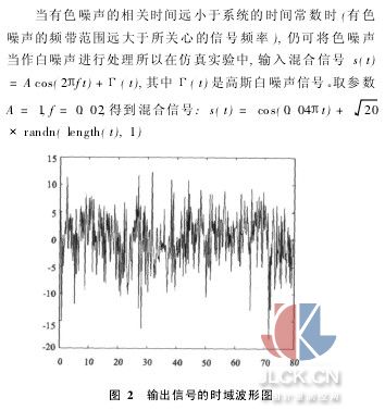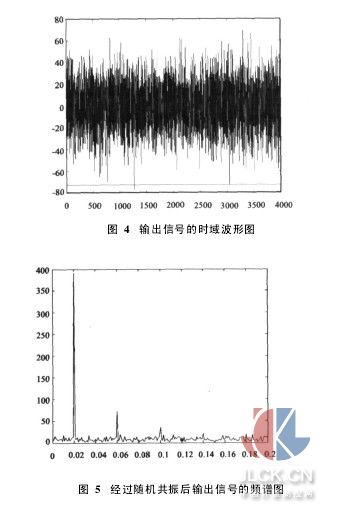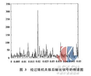 在Matlab平台下对根据上述算法进行迭代计算,并仿真实验,得到上图所示结果。图2为求解得到输出信号的时域波形。图3是经过随机共振后输出的信号频谱图,从该图上可以清楚的看到频率f = 0. 02 Hz处的谱线。说明在此频率处有一个很强的周期成分存在,该频率正好等于输入信号频率。
