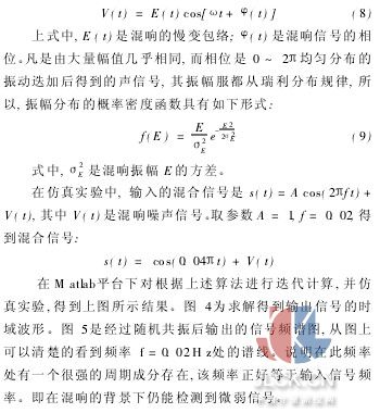 本文探讨了随机共振理论,分析了非线性双稳系统中的随机共振现象,然后把它应用于微弱水声信号检测中。经过数字仿真和分析,我们看出在混响的背景下,经过随机共振可以有效的检测到微弱信号。但是随机共振理论作为一个新兴的理论,整个体系还很不完善,并且在实际工程中还有很多问题需要考虑。例如:①如何克服随机共振提高输出信噪比能力有限的问题?②如何实现自适应随机共振算法,自动产生最佳的信噪比输出?③目前随机共振的研究主要是对单一频率产生共振,那么如何检测含有多个频率的微弱信号?以上这些问题都有待我们作进一步的研究。相信随着随机共振理论研究的深入,这些问题都会得以有效解决。到那时,随机共振将会成为一个新的、强有力的信号处理工具,特别是在信号检测方面发挥巨大的作用。