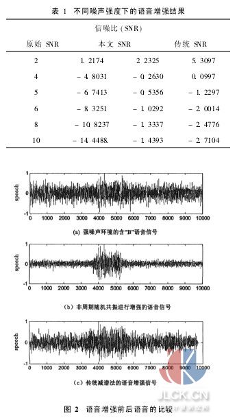通过对反复实验的数据进行分析,由表1和图3可见,在噪声较弱的情况下,相对于传统减谱法,本文方法没有显示出优越性,复原的效果甚至比传统方法差;但是随着噪声逐渐增强,相对于强背景噪声,本文方法明显优于传统算法,且随着噪声强度的增加,语音增强效果越好。针对传统的语音增强方法,削弱噪声来间接地增强有用信号,而处于最优随机共振状态的语音阈值系统是将噪声能量转化为有用信号的能量以此来增强输出信号,由此噪声的强弱对于本文方法抑噪能力的影响相对小。
