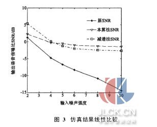 图2表示利用本文提出的多阈值随机共振方法进行语音增强,以及于传统的减谱法进行语音增强效果比较。不同的噪声强度下,采用本文提出的语音增强算法和传统的减普法仿真结果如表1所示。且进行两种算法结果的线性比较如图3所示。