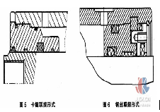 螺纹联接的方式具有结构简单,联接可靠,整体性能好等优点,在液压油缸中普遍采用,结构形式如图 4; 卡键联接的方式具有拆装方便等优点,但也存在着结构复杂、缸口端部易被杂物堵塞、锈蚀等缺点,使用的比较少,结构形式如图 5;钢丝联接(方形、圆形钢丝)方式结果简单,但维修拆装比较困难,一般只用于千斤顶的缸口联接,结构形式如图 6。