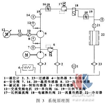 液压泵试验台的液压系统设计是根据液压泵JB/T7042-93规定的试验项目设计的,试验原理如图3所示。