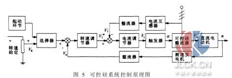 液压泵性能测试装置的拖动系统是液压泵性能测试系统的动力源,其占地大、投资高、能耗大。因此合理的选择是液压泵性能测试装置研制是否成功的关键之一。对于小功率的液压泵性能测试装置,其动力源的选择较为简单,这里不再详叙。作者所设计的液压泵性能试验台不仅要适合低压泵,而且对于中、高压泵也同样适合的测试系统。国内目前中、大型液压泵性能测试装置的拖动系统多为可控硅直流调速系统(其控制原理如图5所示),其占地大、维护困难、投资高,使用极为不便。而大功率的二次调节系统(定压网络液压马达调节系统)因噪声大、系统复杂及投资高而在国内未得到广泛应用,但在利用原有液压泵源的技术改造中是一个可选择的方案。在反复比较了投资、占地面积、噪声控制、维护保养等诸因素后,作者采用交流变频调速技术。