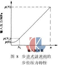 原理如图7所示,步进电机1带动偏心轮2转动,使顶杆3作往复直线运动,从而使调压弹簧的压缩量改变,也就调整了溢流压力,实现了进式自动加载。该步进式溢流阀的步位压力特性如图8所示,当N>N1时, p(N)近似和输入脉冲N成正比,线性度很好。