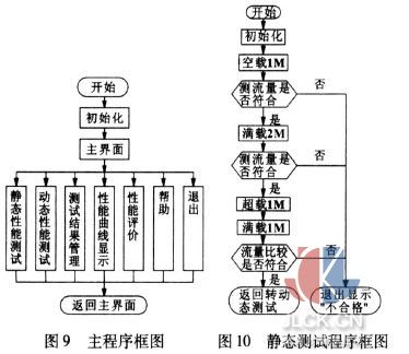 根据液压泵试验台的硬件系统组成及其测试原理,整个计算机自动控制系统软件由以下几个大模块组成:初始化模块、菜单模块、测控和实时显示模块、数据采集及处理软件模块、执行元件驱动模块和文件管理模块。系统软件初始化后,由菜单模块将其余模块联系起来,其中,测控和实时显示是整个系统的核心部分,它包括键盘输入操作、A/D采样、数据处理、D/A输出、曲线显示以及控制执行元件驱动信号等内容。主程序框图如图9所示,其中静态性能测试的程序框图如图10所示。
