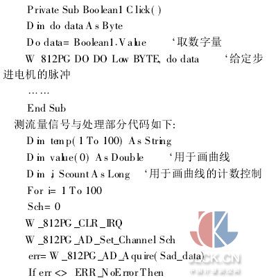 代码的编写可以采用Visual C++, Delphi和VisualBasic等高级语言, VisualC++编程可提高采集速度[14],不必用动态链接库函数来采集数据,但在操作界面和管理数据方面编程效率较VisualBasic低。考虑到系统需要对所测得的数据及时进行比较处理,而且操作界面较为简单,方便工人操作,代码采用VisualBasic语言编写,动态链接库采用C语言和汇编语言来编写。根据预计的信号(Boolean1)进行加载(对步进电机驱动器的控制),开始部分代码如下: