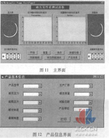 系统的主界面如图11所示。由主界面可以清楚地看到压力和流量随时间的实时动态显示,试验者可以通过鼠标点击主界面的命令按钮来得知产品(被试泵)的各种测试性能和数据。如点击“产品信息”,即出现图12的产品信息界面,从产品信息界面,试验者可以容易地得到产品的基本信息及其质量等级。