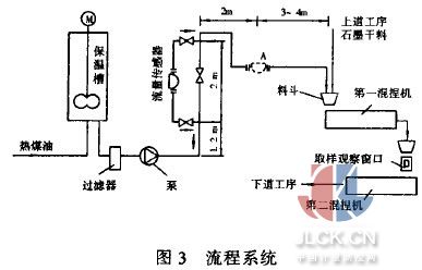 如图3所示,上道工序磨细筛选的粗、中、细、微4种干料按规定比例经皮带秤配料混合后,以恒定流量进人料斗。保温215℃左右,容器内沥青液经过过滤器后由调速电动机拖动的泵打人同一料斗。然后干料和沥青液进人第一混捏机混捏;在进人第二混捏机前,有一取样窗口,可取样观察沥青液和石墨颗粒粘着程度,根据粘着状况调节泵转速以增减沥青液流量,达到控制混捏质量的目的。