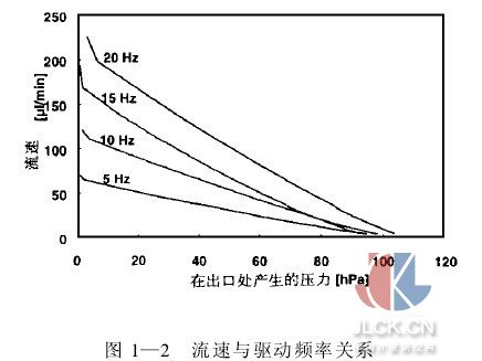 图1―2所示为微型泵流速随气压及驱动器频率的函数关系。