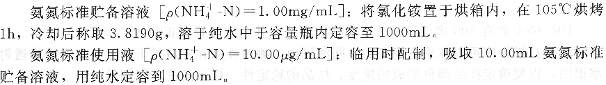 注:配制试剂时应注意勿使碘化钾过剩,过量的碘离子将影响有色络合物的生成,使颜色变浅。贮存已久的纳氏试剂,使用前应先用已知量的氨氮标准溶液显色,并核对吸光度,加入试剂后2h内不得出现浑浊,否则应重新配制。