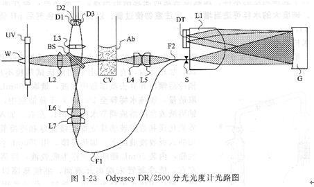 Odysseyr DR/2500分光光度计光路见图1—23,其结构如下。