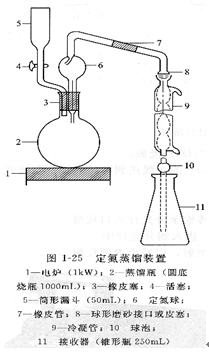 蒸馏:取250mL纯水于全玻璃蒸馏器中(图1-25),加入0.25g轻质氧化镁及数粒玻璃珠,加热蒸馏,直至馏出液用纳氏试剂检不出氨为止,稍冷后倾出并弃去蒸馏瓶中残液,量取250mL水样(或取适量,加纯水稀释至250mL)于蒸馏瓶中,用氢氧化钠溶液或盐酸溶液调节水样至pH7左右。加入0.25g轻质氧化镁和数粒玻璃珠立即连接氮球和冷凝管,导管下端插入吸收液液面下,加热蒸馏,用250mL容量瓶为接收瓶,内装50mL硼酸溶液作为吸收液,待蒸出150mL左右,使冷凝管末端离开液面,继续蒸馏以清洗冷凝管,最后用纯水稀释至刻度,摇匀,供比色用。