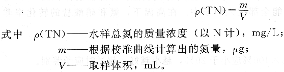 ②样品测定步骤水样采集后,用硫酸酸化到pH<2,在24h内进行测定。取10mL水样或取适量水样(使氮含量为20~80μg),按校准曲线绘制步骤操作,然后按校正吸光度,在校准曲线上查出相应的总氮量,再用下列公式计算总氮含量。
