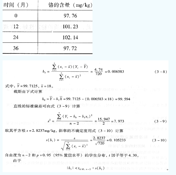 长期稳定性的研究是在不同的时间(例如,以月为单位)积累特性值的测量数据。表3—4给出土壤中铬的稳定性测量数据。将表3—4中的数据,以x代表时间,以y代表标准物质的特性值(铬的含量),拟合成一条直线,则有斜率b1。