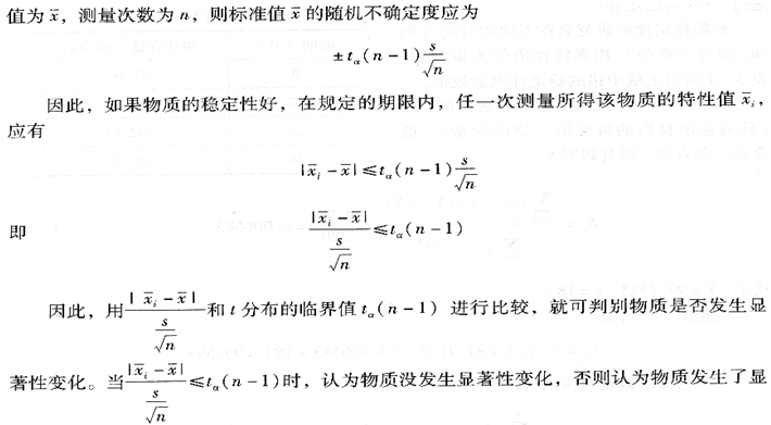 为了评定物质的稳定性,在贮存期间定期抽样测定。在测量误差中,除测量本身由于方法、测量仪器、实验条件的变化等必然带来测量误差外,物质可能发生的变化也会带来误差。为了突出物质变化所引起的那部分误差,在每进行一次测量时,应尽可能控制各种条件,使其趋于一致,选择精密度高的方法,使测量结果之间的差异着重反映出由物质变化所引起的那一部分误差。