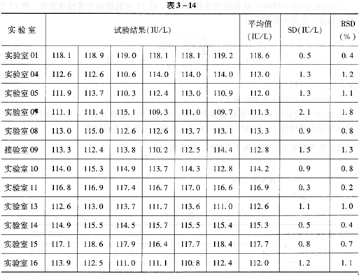 由多个实验室采用重量法、容量法和量热法以及分光光度法在37℃下测量标准物质中γ-谷氨酰转移酶(GGT),测量数据见表3-14。