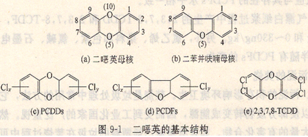 由于氯原子取代位置的不同,使得二噁英种类很多,共有210种异构体,其中有75种PCDD和135种PCDF。其基本化学结构如图9―1所示。
