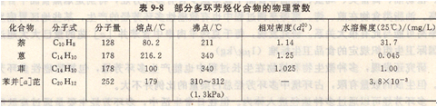 常见的多环芳烃类大多由4~7个苯环组成。三环以上的多环芳烃一般为无色或淡黄色结晶,个别颜色较深。熔点和沸点较高,蒸气压很小。多环芳烃溶液具有一定荧光,在光和氧的作用下可很快分解变质,理化性质随之发生改变,致癌力也明显下降。一些常见多环芳烃化合物的物理常数见表9―8。