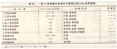 亚硝胺对鱼、小鼠、大鼠、犬和猴等动物的不同组织、器官均有强致癌作用,尤以啮齿动物最敏感。亚硝胺类化合物致癌性差异很大,每日喂饲量1mg/kg或更少时就可致癌,有些仅一次较大剂量就能引起肿瘤。在大鼠的饲料中添加50mg/kg的二甲基亚硝胺,持续26~40周即可诱导大鼠患肝癌;添加O.075mg/kg,830天也可使大鼠患癌。目前,对膳食中N-亚硝基化合物产生致癌性的阈值剂量还没有确定。N-亚硝基化合物的致癌性存在着器官特异性,并与其化学结构有关。例如,二甲基亚硝胺是一种肝活性致癌物,同时对肾脏也表现出一定的致癌活性;苯基甲基亚硝胺对食管有特异性。表9―7列出了一些N-亚硝基化合物对大鼠经口的LD50及致癌性。