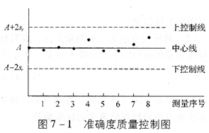 当一个例行测量实验室承担某种经济或者社会意义重大的样品的长期测量任务时,质量保证负责人应使用相应标准物质做长期的准确度控制图,以及时发现与处理测量过程中的问题,保证测量结果的准确性,具体方法如下:质量负责人间断地把标准物质作为密码样品与被测样品一起发给操作者,收集测量结果,以标准物质的保证值(A)做中心线,2倍的测量过程的再现性标准偏差(sr)做上下控制线,以测量日期或者测量序号为横坐标,画准确度控制图(见图7―1)。