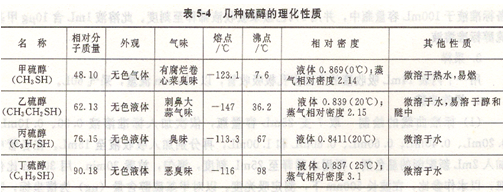 硫醇是石油中常见的有机硫化合物。硫醇化合物为具有强烈臭味的无色气体或液体。硫醇类包括甲硫醇(CH3SH)、乙硫醇(CH3CH2SH)、丙硫醇(C3H7SH)、丁硫醇(C4H9SH)等。其特点为相对分子质量愈大的硫醇,所散出的臭味反而较淡。在空气中多呈蒸气状态存在。空气中乙硫醇的含量达1×10-2mg/m3时,就可感觉到臭味。硫醇与硫化氢相似,具弱酸性,可溶于氢氧化钠溶液而生成硫醇钠。硫醇可以和重金属形成不溶于水的硫醇盐如汞盐、铅盐、铜盐、银盐等。常见的几种硫醇理化性质见表5―4。