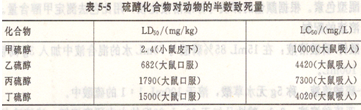 虽然大多数硫醇的毒性不太大,但臭味却很强烈。据报道,在空气中丙硫醇的臭阈值为O.23~2.3μg/m3。乙硫醇的毒性较硫化氢小10倍,丙硫醇和丁硫醇的毒性较乙硫醇还小。硫醇对人的毒害主要是作用于中枢神经系统。吸人低浓度硫醇蒸气可引起头疼、恶心。较高浓度时具有不同程度的麻醉作用,并可引起呼吸麻痹而致死。几种硫醇化合物对动物的半数致死量见表5―5。