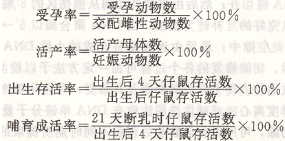 (4)观察指标主要观察以下四个指标,分别反映动物交配受孕、妊娠过程、分娩过程和哺育幼仔成活情况。