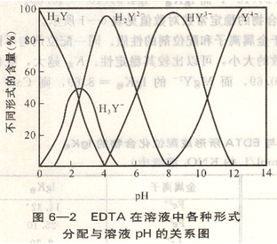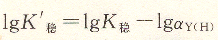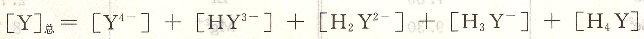 从图6―2可以看出,当pH>12时,EDTA几乎全部是以Y4-形式存在的,只有Y4-才能与金属离子配位,因此, [Y4-]称为有效浓度,用[Y4-]有表示,而[Y]总表示溶液的总浓度,则: