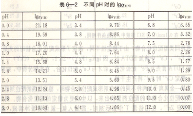 从表中看出ay(H)与溶液酸度有关,随着溶液pH增大而减小,当pH<12时,![]()