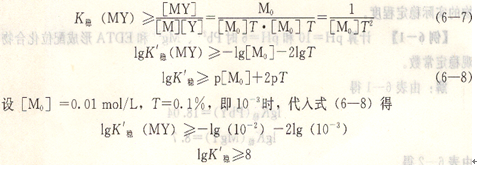 如果被测离子的初浓度为[M0],终点时未配合的金属离子浓度为[M],滴定的允许误差为T(一般为0.1%)。则在滴定终点时必须符合下列要求。