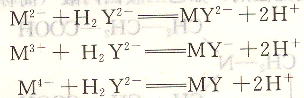 同时,还有4个可电离的H+,一般1~4价的金属离子的配位数大多为4或6,当EDTA与金属离子配位时,一个EDTA分子就能满足一个金属离子的配位数和电荷的要求。所以,当EDTA与1~4价的金属离子配位化合时,其配位化合比大多为1∶1,生成的配位化合物可用下列反应表示。