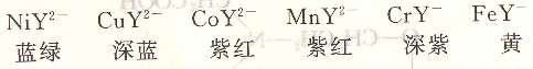 大多数金属离子与EDTA生成的是无色配位化合物,因此,有利于选择适当指示剂来确定终点。但有色离子与EDTA配位一般生成颜色更深的配位化合物,如: