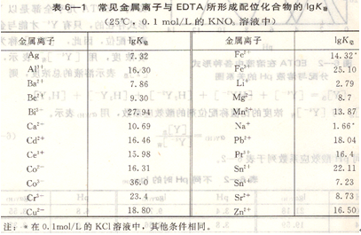 常见金属离子和EDTA的配位化合物的稳定常数对数值见表6―1所示。