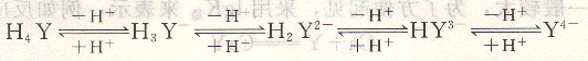 EDTA是一种四元酸,一般用H4Y表示。在水溶液中,具有四级离解平衡关系: