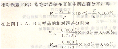 从相对误差的计算可以看出,在绝对误差相同的情况下,当被测定的量较大时,相对误差较小,测定的准确度就比较高。因此比较各种情况下测定结果的准确度,一般采用相对误差较用绝对误差更为确切和方便。