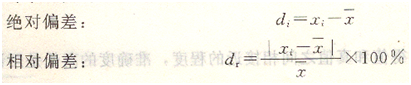 在实际分析实验中,由于不知道被测组分的真值,误差很难求得。因此,通常是对分析样品进行多次平行测定,求多次平行测定结果的算术平均值作为该样品的测定结果。多次平行测定结果之间相互接近的程度叫做精密度。精密度通常用偏差来表示,偏差是指在几次测量中单次测定结果与几次平行测定结果的平均值之间的差值。偏差越小,测定结果的精密度就越高。偏差也有绝对偏差(di)和相对偏差(dr)之分。测定结果与平均值之差为绝对偏差。绝对偏差在平均值中所占的百分率为相对偏差,即: