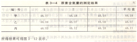 测定结果的精密度是以平均结果为标准,表示出测定结果的重现性。准确度则是以真实值为标准,表示测定结果的正确性。精密度是保证准确度的先决条件。精密度差表明测定结果的重现性差,所得结果不可靠;但是精密度高却不一定准确度也高。因为测定结果中有可能包含需要进行校正的系统误差。只有精密度高、准确度也高的测定数据才是可信的。因此,应从准确度和精密度两个方面才衡量测定结果的好坏。例如,在相同条件下,甲、乙、丙三人分别对某尿素样品进行分析,测定结果如表3―4所示,真值为46.05%。