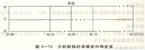 从图3―12中可以看出,甲的分析结果的精密度较高,但平均值和真实值相差较大,准确度不高,说明系统误差大,偶然误差小;乙的分析结果的精密度和准确度都较高,说明其系统误差和偶然误差都较小;丙的分析结果的精密度和准确度都差,说明其系统误差和偶然误差都大。