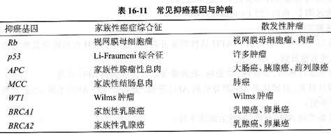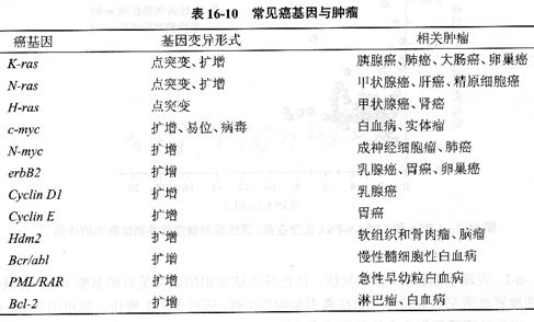 肿瘤在本质上是基因病。各种环境的和遗传的致癌因素以协同或序贯的方式引起DNA损害,从而激活原癌基因和(或)灭活肿瘤抑制基因,加上凋亡调节基因和(或) DNA修复基因的改变,继而引起表达水平的异常,使靶细胞发生转化。原癌基因的激活方式主要有:①基因突变引起蛋白质结构和功能的改变;②基因扩增导致基因拷贝数增加;③染色体易位使癌基因转录水平升高或其表达蛋白结构异常;④病毒基因插入诱导癌基因转录。原癌基因激活转变成癌基因,导致肿瘤的发生,癌基因的检测有助于诊断和治疗(表16-10)。抑癌基因失活的主要方式包括:①基因突变;②杂合性缺失(LOH)③启动子区甲基化异常 (表16-11)。